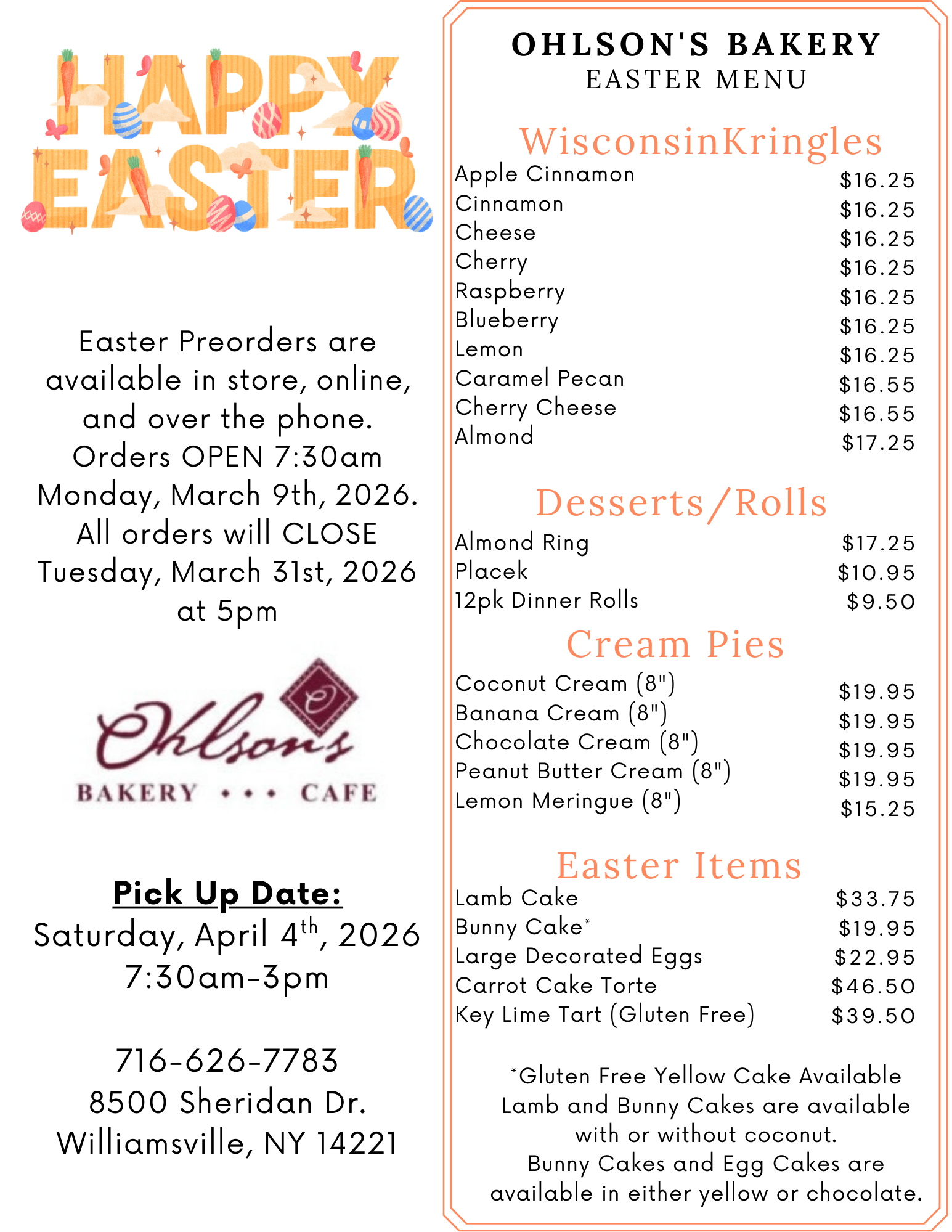 Here’s a look at our Easter menu! Available to preorder in person, over the phone, or online now through March 31st.